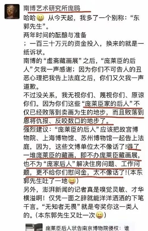 然而在此后,庞鸥非但没有半点反思与收敛,反而越发嚣张跋扈,甚至在朋友圈自比 “东郭先生”,喊冤叫屈,声称自己花钱办展让庞莱臣重获声名,到头来却被反咬一口,这般颠倒黑白、倒打一耙的行径,让其 “学术” 外衣彻底剥落殆尽,露出为达目的不择手段的功利内核。更令人咋舌的是,吃了官司的庞鸥并未受到任何实质影响,反而一路升任江苏省文化艺术研究院副院长、南京博物院古代艺术部主任。他这般有恃无恐的背后,无疑是徐湖平这棵 “大树” 的倾力庇护。