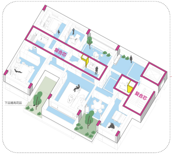 围绕代际差异化诉求,打造相对独立的生活圈,听起来是不是非常心动?别急,还有。同为一等奖获奖作品的“芯院”,则融合了“复合芯筒”与“东方院居”两大核心策略,既将所有用水空间及设备管线集中布置于“芯筒”,实现房屋管线的系统集成与长效运维,又通过两层挑高的内嵌型立体庭院引入更多阳光,使景观与室内空间形成交融与互动。中国建筑设计研究院教授级高级建筑师吕强介绍,这套设计方案以“复合芯筒”为骨,构建出高效、自由、可持续的百年住宅基底,又以“东方院居”为魂,用当代设计语言重新诠释院落精神。